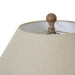 Sculpted natural wood base with soft linen shade for texture and warmth
